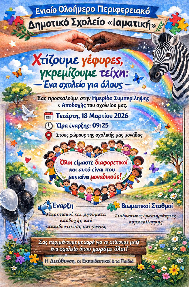 Στις 18 Μαρτίου του 2026 πραγματοποιήθηκε στο σχολείο μας η Ημερίδα Συμπερίληψης και Αποδοχής. Μια ημέρα αφιερωμένη στην καλλιέργεια της ΑΠΟΔΟΧΗΣ, την ΣΥΜΠΕΡΙΛΗΨΗΣ και τον ΣΕΒΑΣΜΟ της ΔΙΑΦΟΡΕΤΙΚΟΤΗΤΑΣ και της ΜΟΝΑΔΙΚΟΤΗΤΑΣ του ΚΑΘΕ ΠΑΙΔΙΟΥ.