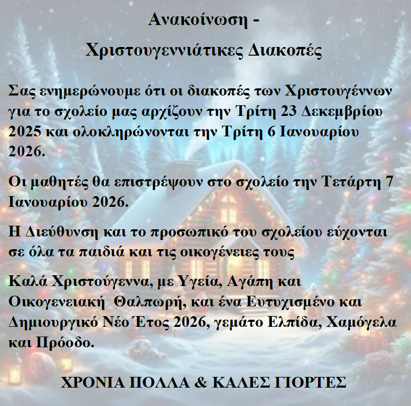 Χριστουγεννιάτικες Διακοπές Χριστουγεννιάτικες Διακοπές Ανακοίνωση - Χριστουγεννιάτικες Διακοπές Σας ενημερώνουμε ότι οι διακοπές των Χριστουγέννων για το σχολείο μας αρχίζουν την Τρίτη 23 Δεκεμβρίου ...